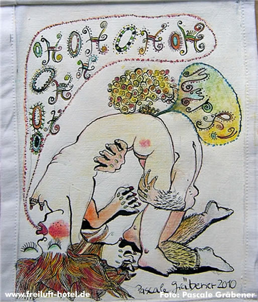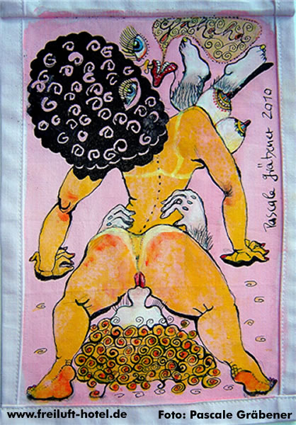 Pascale Gräbener zeigt gezeichnete zu lüpfende erotische Bettgeschichten unter der Hotelbettdecke auf Bettwäsche.