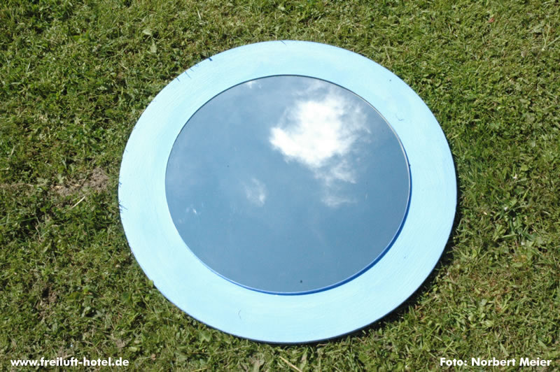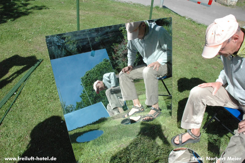 Norbert Meier versucht in seiner Spiegelinstallation dem Gefühl nachzuspüren, wie es ist mit dem Freiluftluftschiffhotel durch das Wolkenmeer zu fahren.
